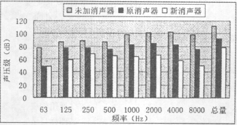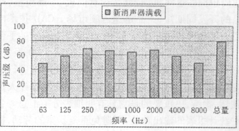 取下原消聲器,將新設(shè)計好的消聲器安裝在原機(jī)組上,其它實驗條件不變,對新消聲器對各頻段的消聲量及總消聲量進(jìn)行測量,其結(jié)果見圖4。