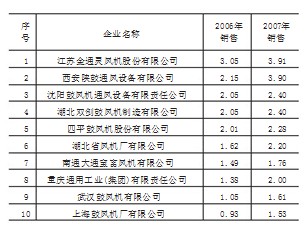 根據(jù)中國(guó)通用機(jī)械協(xié)會(huì)《2007年通用機(jī)械行業(yè)部分會(huì)員統(tǒng)計(jì)年報(bào)匯總表》數(shù)據(jù)計(jì)算,離心風(fēng)機(jī)行業(yè)規(guī)模以上企業(yè)2007年總銷售值約170億元;同時(shí)我國(guó)各行業(yè)仍有相當(dāng)部分重要離心風(fēng)機(jī)還需依賴進(jìn)口,如鋼廠燒結(jié)主抽離心風(fēng)機(jī)、污水處理行業(yè)單級(jí)高速離心鼓風(fēng)機(jī)、焦化行業(yè)的循環(huán)風(fēng)機(jī)、石化行業(yè)的專用離心鼓風(fēng)機(jī)、鋼廠冷軋線工藝風(fēng)機(jī)等,該部分離心風(fēng)機(jī)市場(chǎng)約60億元左右。根據(jù)以上綜合統(tǒng)計(jì),2007年離心風(fēng)機(jī)市場(chǎng)規(guī)模約230億元。據(jù)《中國(guó)風(fēng)機(jī)制造業(yè)廠商名錄》(2008年)統(tǒng)計(jì),其中我國(guó)離心風(fēng)機(jī)生產(chǎn)廠家共1300多家,根據(jù)風(fēng)機(jī)協(xié)會(huì)統(tǒng)計(jì),其中,年銷售規(guī)模過億元的企業(yè)30家左右,超過5000萬元的企業(yè)約130家,其余大多數(shù)企業(yè)為地域分散的中小企業(yè)。近年來,離心風(fēng)機(jī)行業(yè)銷售凈利率大約為39% 49%。根據(jù)《二零零六年風(fēng)機(jī)行業(yè)統(tǒng)計(jì)年鑒》和《二零零七年風(fēng)機(jī)行業(yè)統(tǒng)計(jì)年鑒》統(tǒng)計(jì),2006~2007年離心風(fēng)機(jī)產(chǎn)品銷售額前10位的企業(yè)見表1。表2006~2007年離心風(fēng)機(jī)產(chǎn)品銷售金額前10位的企業(yè) (單位:億元).jpg)
