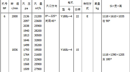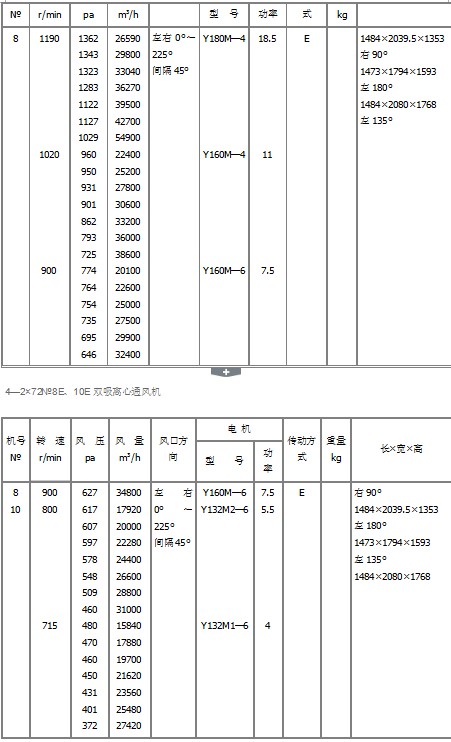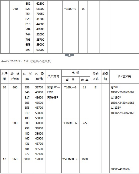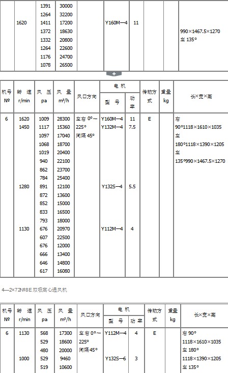 1、風機采用雙吸入進氣,機號有6E、8E、10E、12E、14E、16E、18E、20E。