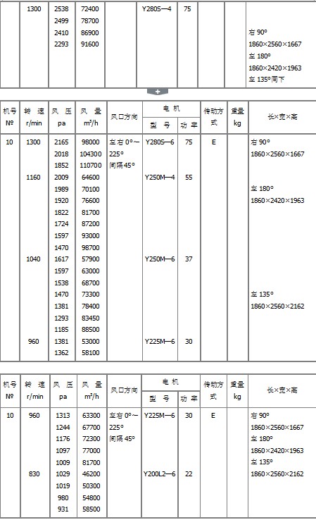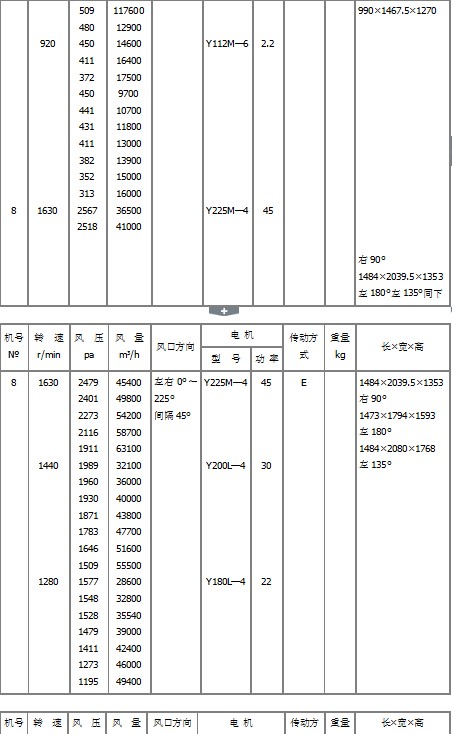 4-70型離心通風機№.2.8~6出風口位置為0°-225°,間隔為45°,傳動方式為A式傳動;№.7~12出風口位置為0°、90°、180°,№.7~12傳動方式為C式傳動。