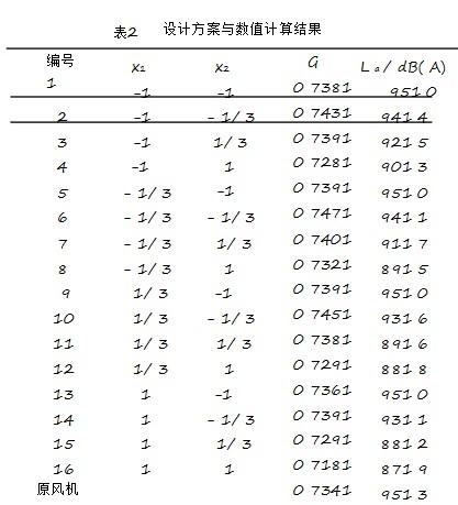 在考慮兩個(gè)參數(shù)對(duì)風(fēng)機(jī)效率 G 和 A 聲級(jí) L a 的影響時(shí), 采用完全析因設(shè)計(jì)法選取樣本點(diǎn), 數(shù)值計(jì)算