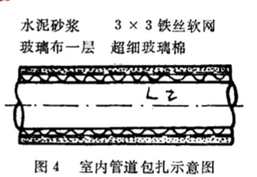 底層用 超細(xì)玻璃棉厚5cmc , 然后用 一層 玻璃布扎緊, 目的起吸 聲作用 , 再用鐵絲軟 網(wǎng)纏 繞一層, 水泥 砂漿抹面厚 3cm , 起 隔聲 作用 。