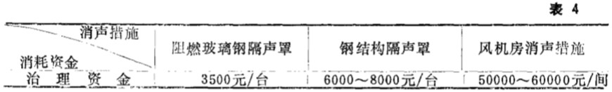5 . 2 . 1 . 節(jié) 約治理資金。 表 4 是同類型 風(fēng)機(jī)及風(fēng)機(jī)房消聲措施所消耗資 金 的 比 較 表。